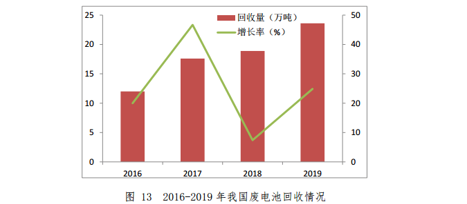 2019年,廢電池(鉛酸電池除外)回收量約 23.6 萬(wàn)噸, 同比下降5.5%。其中,不能充電的一次電池回收量約2.5 萬(wàn) 噸,能夠充電的二次電池回收量約21.1萬(wàn)噸。2016-2019 年我國(guó)廢電池回收情況如圖 13 所示。