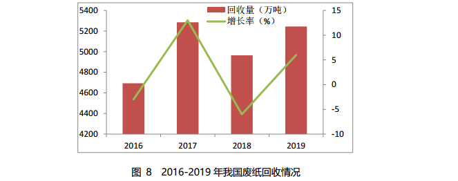 2019 年,我國(guó)廢紙回收量約 5244 萬(wàn)噸,同比增長(zhǎng)5.6%,廢紙回收率為 49.0%,廢紙利用率為 58.3%。在固體廢物進(jìn)口政策影響下,進(jìn)口廢紙量持續(xù)下滑,國(guó)內(nèi)廢紙回收量呈上升趨勢(shì)。2016-2019 年我國(guó)廢紙回收情況如圖 8 所示。