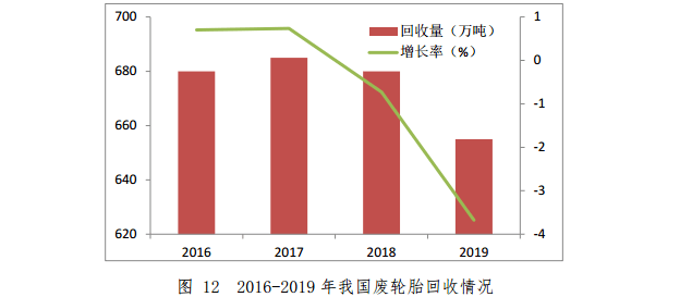 2019年,我國(guó)汽車(chē)輪胎產(chǎn)量為6.5億條,其中國(guó)內(nèi)消耗約3.8億條。2019年,廢輪胎回收利用企業(yè)約1500家,從業(yè)人員約10萬(wàn)人,回收量約2億條,回收重量約655萬(wàn)噸,同比下降3.7%。其中,輪胎翻新量約500萬(wàn)標(biāo)準(zhǔn)折算條,再生橡膠產(chǎn)量約300萬(wàn)噸,橡膠粉產(chǎn)量約100萬(wàn)噸,熱裂解處理量約100萬(wàn)噸。2016-2019年我國(guó)廢輪胎回收情況如圖12所示。