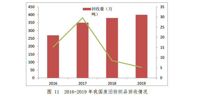 2019 年,我國(guó)棉、化纖和絲三類(lèi)紡織纖維加工量約6610萬(wàn)噸。據(jù)估算,每年產(chǎn)生廢舊紡織品超過(guò) 2000 萬(wàn)噸,一類(lèi)是消費(fèi)前工業(yè)加工領(lǐng)域的邊角料等,基本得到再生利用,另一類(lèi)是閑散在居民手中的大量廢舊衣物和紡織品,再生利用率約 15%。2019年,我國(guó)廢舊紡織品回收量約為 400 萬(wàn)噸, 同比增長(zhǎng) 5.3%。2016-2019年我國(guó)廢舊紡織品回收情況如圖 11 所示。