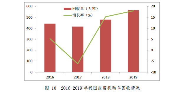 截至2019年底,我國(guó)報(bào)廢機(jī)動(dòng)車(chē)回收拆解企業(yè)共755家,回收網(wǎng)點(diǎn)約2271個(gè),從業(yè)人員約2.4萬(wàn)人。2019年,機(jī)動(dòng)車(chē)回收數(shù)量為229.5萬(wàn)輛,同比增長(zhǎng)15.3%,其中汽車(chē)195.1萬(wàn)輛,同比增長(zhǎng)16.8%;摩托車(chē)34.4萬(wàn)輛,同比增長(zhǎng)7.1%。按照車(chē)輛類(lèi)型分,客車(chē)回收量為138.7萬(wàn)輛,同比增長(zhǎng)17.1%;貨車(chē)45.3萬(wàn)輛,同比增長(zhǎng)18.9%;掛車(chē)5.5萬(wàn)輛,同比增長(zhǎng)29.3%;專(zhuān)項(xiàng)作業(yè)車(chē)2.8萬(wàn)輛,同比下降1.4%。2016-2019年我國(guó)報(bào)廢機(jī)動(dòng)車(chē)回收情況如圖10所示。