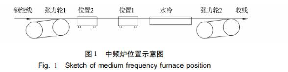 預應力混凝土鋼絞線生產中,鋼絞線穩(wěn)定化處 理生產線使用的中頻感應加熱爐為移動式( 如圖 1 所示) 。生產線停止運行時中頻感應加熱爐處于位 置 1,生產線啟動運行時中頻感應加熱爐由位置 1 向與穩(wěn)定化處理鋼絞線反方向移動至位置 2,生產 結束時中頻感應加熱爐由位置 2 移動至位置 1。正 常生產中鋼絞線經中頻感應加熱爐加熱后進入生產 線冷卻水槽( 圖 2) 冷卻,再經壓縮空氣吹干。生產 線停止運行時,在中頻感應加熱爐由位置 2 移動至 位置 1 過程中,其兩端自帶的冷卻與吹干裝置自動啟動,對位置 2 與生產線冷卻水槽之間的部分鋼絞 線進行冷卻、吹干處理,從而使這部分鋼絞線與正常 生產的鋼絞線性能一致,以降低消耗,提高鋼絞線的 成材率。
