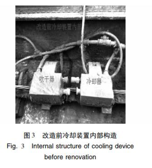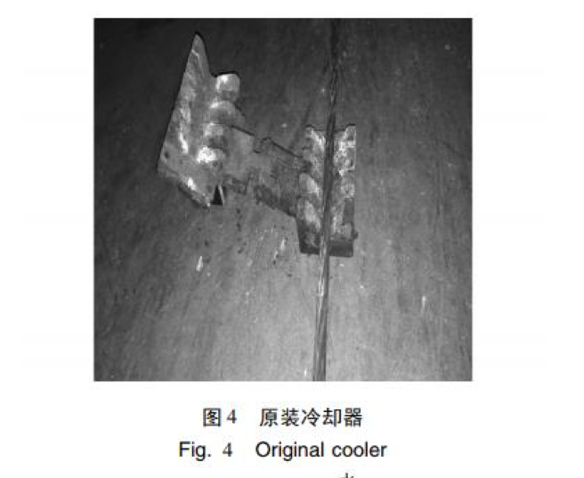 長期生產運行中,發(fā)現(xiàn)中頻爐兩端原 裝的冷卻裝置冷卻效果不佳,既影響產品質量,又易 造成鋼絞線整根斷裂,存在極大的安全隱患,對人身 和設備造成傷害。 正常生產的鋼絞線經冷卻后溫度不高于 60 ℃[4],而經中頻爐自帶的冷卻裝置一次自動冷卻后 的鋼絞線溫度仍然過高,約 150 ℃ 左右[5],如果此 時生產線啟動,將對此部分鋼絞線進行二次加熱,由 于溫度疊加,造成溫度急劇上升,使鋼絞線加熱溫度 過高,在 30% ~ 50% 抗拉強度的張拉力作用下易造 成鋼絞線整根斷裂。為避免此現(xiàn)象發(fā)生,必須由人 工操作,將中頻爐在位置1 與位置2 之間行走2 至3 次,才能將鋼絞線的溫度降至 60 ℃以下。這樣操作 既浪費時間也降低生產效率。而且由于需要反復多 次冷卻,中頻爐冷卻器、吹干器等相關部件使用頻次 增加,維護成本提高。 經反復查找,發(fā)現(xiàn)中頻爐原裝的冷卻裝置( 圖 3) 冷卻效果差與其冷卻器( 圖 4) 有關,原設計冷卻器與吹干器為銅制合頁式交錯咬齒形結構,該設計 存在以下問題: ( 1) 采用噴淋式冷卻,冷卻面積小。 ( 2) 冷卻器短,長度只有 135 mm。 ( 3) 冷卻水流量小,只有 16 個直徑為 1 mm 的 出水口。 ( 4) 冷卻器數(shù)量少,受設備總體布局的約束,中 頻爐兩端分別有一個冷卻器。 ( 5) 工作環(huán)境高溫、高油煙,冷卻器出水孔易堵 塞,不能正常工作。 ( 6) 生產線停止運行時,中頻爐由位置 2 向位 置 1 移動過程中,由于鋼絞線沒有張力,受重力作用 鋼絞線自然下垂造成冷卻器磨損。由于冷卻器結構 復雜難加工,因此制造成本高。