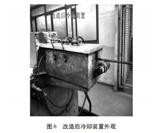 針對原中頻爐冷卻裝置存在的缺陷,經過研究 并結合多年的設備、生產及工藝方面的相關經驗,設 計出全新的 V 型直冷式可控大流量冷卻裝置。改 造后冷卻裝置內部結構如圖 5 所示,冷卻裝置外觀 如圖 6 所示。 改造后的冷卻裝置特點: ( 1) 新裝置采用加長 V 型水槽儲水冷卻,水槽將原來冷卻水管道直徑由 10 mm 增加到 16 mm,冷 卻水的供給量增大了 2. 5 倍。因為 V 型水槽容積 小能使冷卻水充分快速流動而帶走大量熱量,同時 由于儲水式冷卻能使鋼絞線始終浸泡在冷卻水中, 增大了冷卻的面積,只需一次冷卻即可將鋼絞線冷 卻至60 ℃以下,保證了冷卻的效果。 ( 2) 在冷卻裝置中加裝了導線輥,當生產線停 止運行時,中頻爐由位置 2 向位置 1 移動過程中,導 線輥與導線輪對下垂的鋼絞線起到支撐,避免鋼絞 線懸空,使鋼絞線不與噴氣吹干部分及 V 型冷卻水 槽接觸,不會對冷卻水槽產生磨損。 ( 3) 新的冷卻裝置與吹干裝置不會堵塞,完全 能在高溫、高油煙環(huán)境下正常工作,無需清理新的冷卻裝置與吹干裝置使用效果良好,適合所有規(guī)格鋼絞線的生產。改造成本低,使用壽命長。 既避免了鋼絞線整根斷裂,又消除了安全隱患,實現(xiàn) 了無人化操作,提高了鋼絞線的成材率和勞動生 產率。
