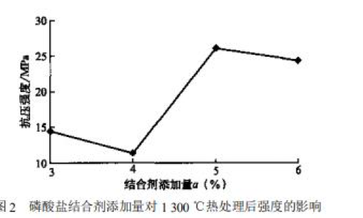 圖1、圖2是以磷酸鹽為結合劑、Al-80水泥為固化劑的四個配方試樣的性能檢測結果,隨著結合劑添加量的增大,110℃×24h烘干后澆注料試樣的抗壓強度呈上升趨勢,但在≤4%和≥5%的添加量范圍內(nèi),隨結合劑添加量的增加試樣的抗壓強度增大幅度很小,而在4%~5%的范圍內(nèi),抗壓強度隨結合劑添加量的增加而急劇提高。對于經(jīng)1300℃熱處理后的試樣,結合劑添加量在≤4%和≥5%的范圍內(nèi),試樣的抗壓強度隨結合劑的增加而呈微弱的下降趨勢,但抗壓強度隨結合劑添加量的增加而急劇提高。綜合可見,對于本實驗選擇的原材料與實驗范圍內(nèi),磷酸鹽結合劑合理的添加量為4%~5%。