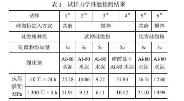 表1是以不同種類、不同添加量的硅微粉為結合劑和以磷酸鹽、Al-80水泥為固化劑的澆注料力學性能檢測結果。由表1可見,硅微粉的種類、加入方式、添加量以及固化劑種類對試樣的力學性能影響較大。由1#、2#試樣和5#、6#試樣的檢測結果可見,與硅微粉的直接攪拌加入方式相比,共磨加入方式能明顯改善澆注料的力學性能。由3#、4#試樣的檢測結果可見,固化劑種類對澆注料性能影響較大,并可看出磷酸鹽與Al-80水泥組成的復合固化劑具有明顯改善修補料性能的效果,而Al-80水泥則效果不明顯。由2#、3#試樣的檢測結果可見,硅微粉添加量的提高未能提高澆注料的力學性能。由采用相同的加入方式而硅微粉來源不同的1#、5#和2#、6#試樣的檢測結果可見,??瞎栉⒎叟c武鋼硅微粉相比,能明顯改善澆注料熱處理后的力學性能,并且添加??瞎栉⒎鄣臐沧⒘峡箟簭姸入S試樣的熱處理溫度的提高而不斷增大。綜合可見,宜采用??瞎栉⒎圩鳛殒V質澆注料的結合劑,合適的添加量應為3c%左右。