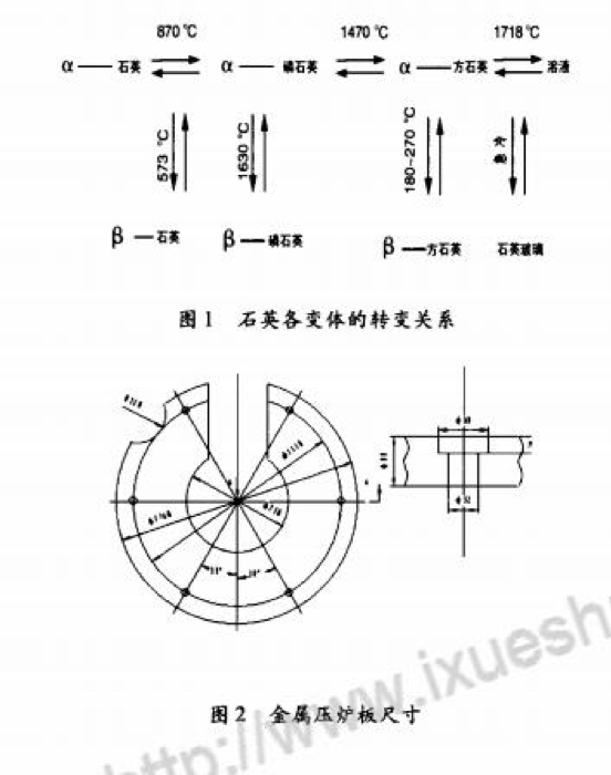 目前國內中頻爐用于熔煉鑄鐵的普通爐襯材料使用的是SiO:石英砂。自然界的石英是低溫型的。開始加熱時,石英砂隨溫度升高而均勻膨脹。在573~C時發(fā)生同質異晶轉變,低溫石英轉變成高溫目前國內中頻電爐用于熔煉鑄鐵的普通爐襯材料使用的是SiO:石英砂。石英后因晶體轉變而突然膨脹(這個轉變是可逆的)。高溫石英砂在870~C以上和有溶劑存在的條件下會轉變成磷石英,但轉變速度很慢。升高溫度可加快轉變,但即使在1250—1350℃高溫下亦需1小時左右才能完成。此時體積增大1.6倍,磷石英在1470℃以上變成方石英。方石英在1713℃以上融化,冷卻后變成石英玻璃,如圖1所示。