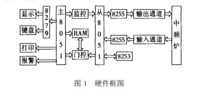 本系統(tǒng)是以 2 片 8051 單片機外圍接口電路構 成的一個主從式雙工中頻電爐爐溫控系統(tǒng) ,硬件總體框圖如 圖 1 所示。