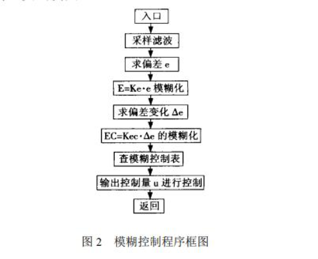 中頻爐溫度的模糊控制器是模糊控制系統(tǒng)的核心 ,它是一 種利用專家知識和操作者經驗設計的專家控制系 統(tǒng) ,設計時不用數學解析模型來描述受控系統(tǒng)的 特性。在本溫度控制系統(tǒng)設計中 ,采用二維模糊 控制器 ,即以偏差 e 和偏差變化率Δe 作為模糊控制器的輸入變量 ,把加熱操作量作為輸出變量。 在模糊控制過程中 ,同時把偏差和偏差的變化率 作為模糊輸入量 ,這種方法不僅能保證系統(tǒng)控制 的穩(wěn)定性 ,而且還可減少超調量和振蕩現象。根 據受控系統(tǒng)的實際情況 ,確定輸入變量的測量范 圍和輸出變量的控制作用范圍 ,以確定每個變量 的論域 , Ke、Kec 和 Ku 分別為輸入和輸出變量的 量化因子和比例因子。先經限幅處理 ,再經量化 處理就得到了 E 和 EC。根據當前已求得的 E 和 EC ,直接查詢模糊控制表就獲得控制量的變化值 ΔU ,將該變化值ΔU 乘以比例因子 Ku ,即可得到 當前的實際控制量增量Δu。再將該增量和前一采 樣時刻的實際控制量相加 ,就得到目前應實施的 控制動作 ,即 uk = uk - 1 + Ku ·ΔU ,其模糊控制 程序框圖如圖 2 所示。