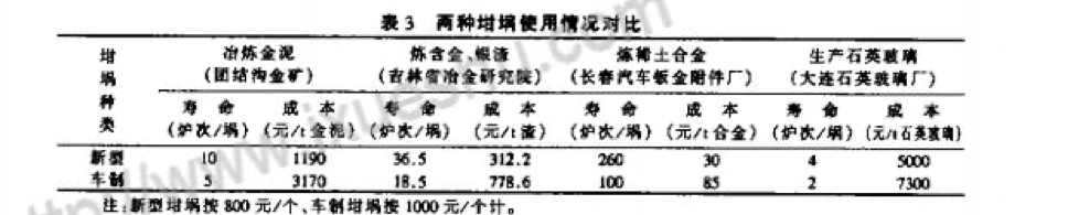 根據(jù)用戶反饋的情況,兩種中頻電爐坩堝的使用性能差別很大。新型石墨坩堝無砂眼、不滲漏;耐腐蝕性均勻,使用壽命長而穩(wěn)定。電極車制坩堝常出現(xiàn)砂眼和滲漏,并且無規(guī)則,使用壽命長短不一.很難掌握冶煉爐次,經常造成漏爐事故。兩種中頻電爐坩堝的使用情況對比見表3。