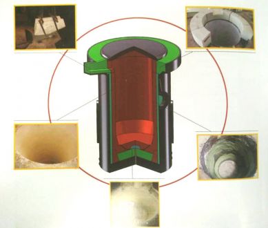 在加爐襯料時(shí)由于坩堝的設(shè)計(jì)和爐子的需要,這個(gè)在爐襯底部會有一段斜坡,此位置直接關(guān)系到爐襯的使用壽命,在施工斜坡位置時(shí)重點(diǎn)就是要注意此位置石英砂的排氣工作,由于斜坡位置的爐襯料不是垂直的,在用震動馬丁震實(shí)時(shí)此位置的爐襯料不能完全靠自身的重力來增加料的密度,為了能使石英砂能達(dá)到更好的密度,在這個(gè)位置我們一般才用少加料,多排氣的方式來進(jìn)行施工,此位置每次的加料高度應(yīng)保持在5-6CM,先找平然后再進(jìn)行排氣6-8遍,排氣完成后進(jìn)行刮毛然后再進(jìn)行第二次加料,在施工部位超出斜坡部位后,加料的厚度可以有所增加,但也應(yīng)該保持在10CM以內(nèi)。整個(gè)爐襯施工中一定要仔細(xì)認(rèn)真,在每進(jìn)行一次加料工作后要用手電等照明工具來觀察加料的情況,要確認(rèn)備襯沒有被爐料沖開,以及有沒有異物進(jìn)入爐料。每次排氣后還應(yīng)該進(jìn)行確認(rèn)備襯情況是否完整,有沒破損等。整個(gè)爐襯加料完成后把坩堝用電焊固定住,可以防止坩堝在進(jìn)行震實(shí)作業(yè)時(shí)出現(xiàn)移位。在震實(shí)作業(yè)前還應(yīng)予留一部分爐料,用來及時(shí)補(bǔ)充在震實(shí)過程中下降的爐襯料,有條件此位置應(yīng)該用封口料最好。由于我們是使用氣動馬丁來震實(shí)爐襯料,一般要求氣壓最少要有0.42Mpa,然后震實(shí)3分鐘以上,如果氣壓不夠大,可適當(dāng)延長震動時(shí)間,一定要確保爐襯料有一個(gè)足夠的密度。同時(shí)在震實(shí)時(shí)還要注意馬丁的固定情況,如有松動現(xiàn)象立即關(guān)掉氣壓,緊固后再進(jìn)行震實(shí)作業(yè)。